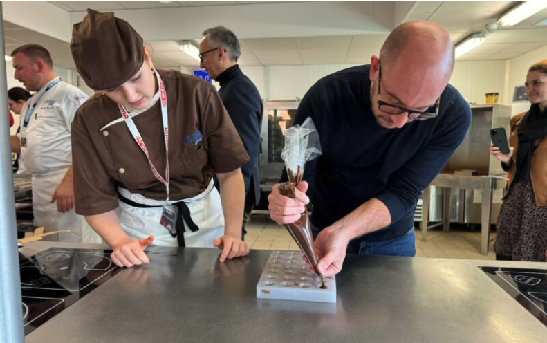 Des binômes construits autour de jeunes apprenants ayant chacun accueilli une personnalité « on a commencé par la carrosserie, ils ont fait une activité de débosselage » avec deux femmes en CAP Carrosserie, comme l’indique Frédéric Brangeon. Puis la journée s’est poursuivie par l’ébénisterie avec l’utilisation d’outils spécifiques « ils ont taillé une pyramide dans un morceau de bois » autour d’un apprenti qui « leur faisait voir le geste » précise le président de la CMA Loire-Atlantique. La dernière étape de ce parcours spécial s’est terminée en chocolaterie avec là aussi l’apprentissage des gestes lié au métier « ils leur ont fait voir comment mouler un bonbon, comment mettre une ganache dans un bonbon » précise t-il.